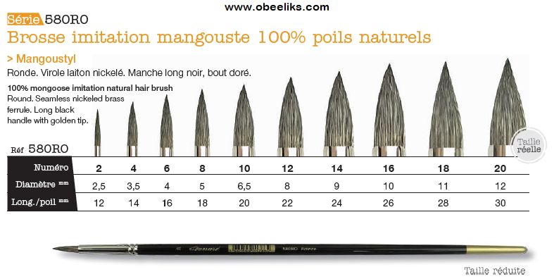 Pinsel aus extra Mangoustehaaren. Rund. Nahtlose Silberzwinge. Langer braunlackierter Stiel, vergoldete Spitze.