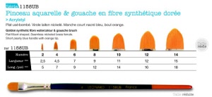 Pincel para acuarela y aguada en fibra sintética dorada 0,10mm. Plano en forma de almendra. Virola de latón niquelado. Mango corto nacarado azul, contera naranja.