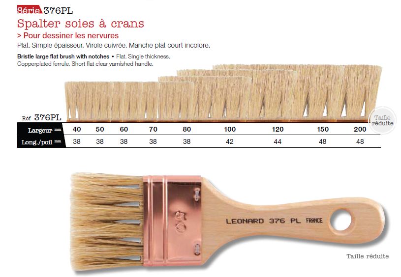 Pinsel ancho con muescas en cerdas. Plano. Simple espesor. Virola encobrada. Mango plano corto incoloro.