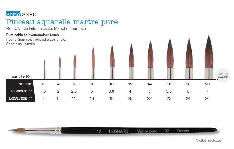 Pure sable hair watercolour brush. Round. Seamless nickeled brass ferrule. Short black handle.
