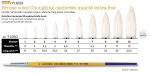 Pincel en cerdas Chungking curvadas al natural extra finas. Redondo. Virola de latón niquelado larga. Mango largo amarillo, contera azul.
