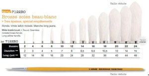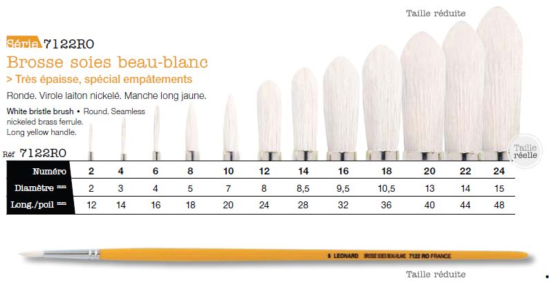 Pincel en cerdas blancas. Redondo. Virola de latón niquelado. Mango largo amarillo.