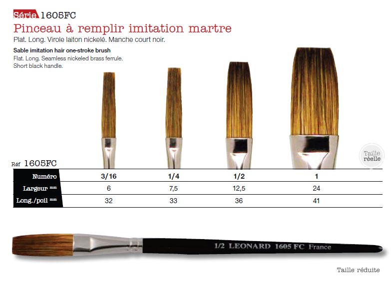 Pincel para rellenar en imitación marta. Plano. Longitud de pelo : larga. Virola de latón niquelado. Mango corto negro.