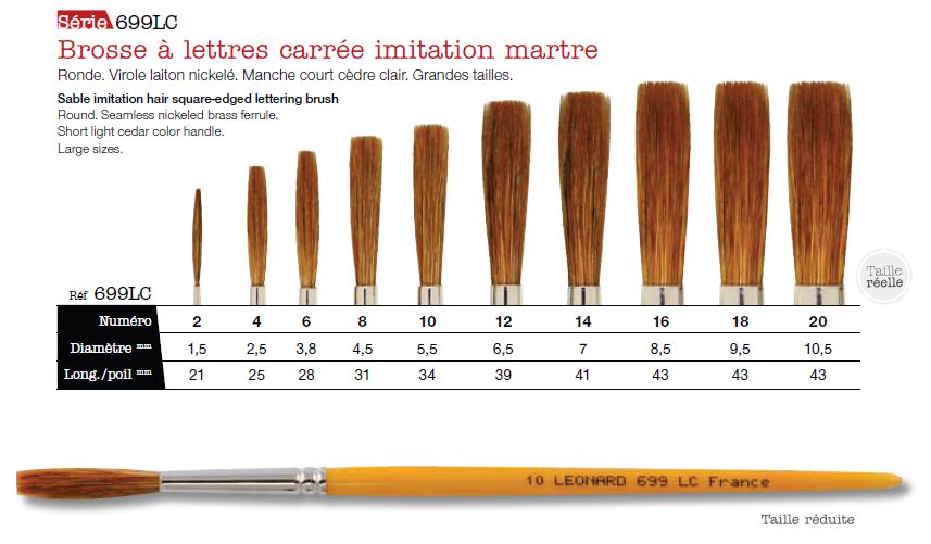 Sable imitation hair square-edged lettering brush. Round. Seamless nickeled brass ferrule. Short light cedar colour handle. Large sizes.