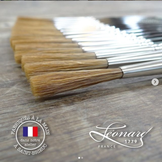 Pincel para letras cuadrado en imitación marta. Redondo. Virola de latón niquelado. Mango corto color cedro claro. Grandes dimensiones.
