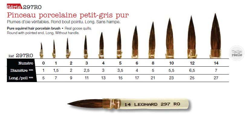 Pincel en petigrís puro para la porcelana. Fijado en una pluma. Redondo con extremidad puntiaguda. Longitud de pelo : normal. Sin mango.
