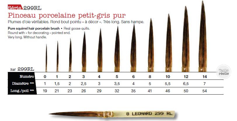 Pincel en petigrís puro para la porcelana. Fijado en una pluma. Redondo con extremidad puntiaguda. Longitud de pelo : muy larga. Sin mango.