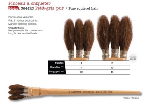 Pure squirrel hair chiqueter brush. Fixed with quills. Flat. 3 pointed locks. Long flat natural polished handle.