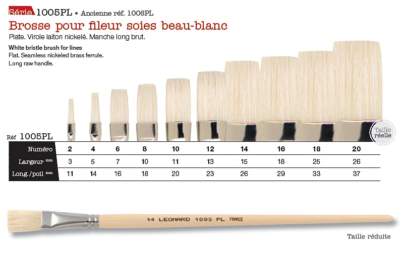White bristle brush for lines. Flat. Long length out. Seamless nickeled brass ferrule. Long raw handle.