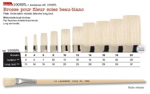 Pincel para lineas en cerdas blancas. Plano . Longitud de pelo : larga. Virola de latón niquelado. Mango largo bruto.