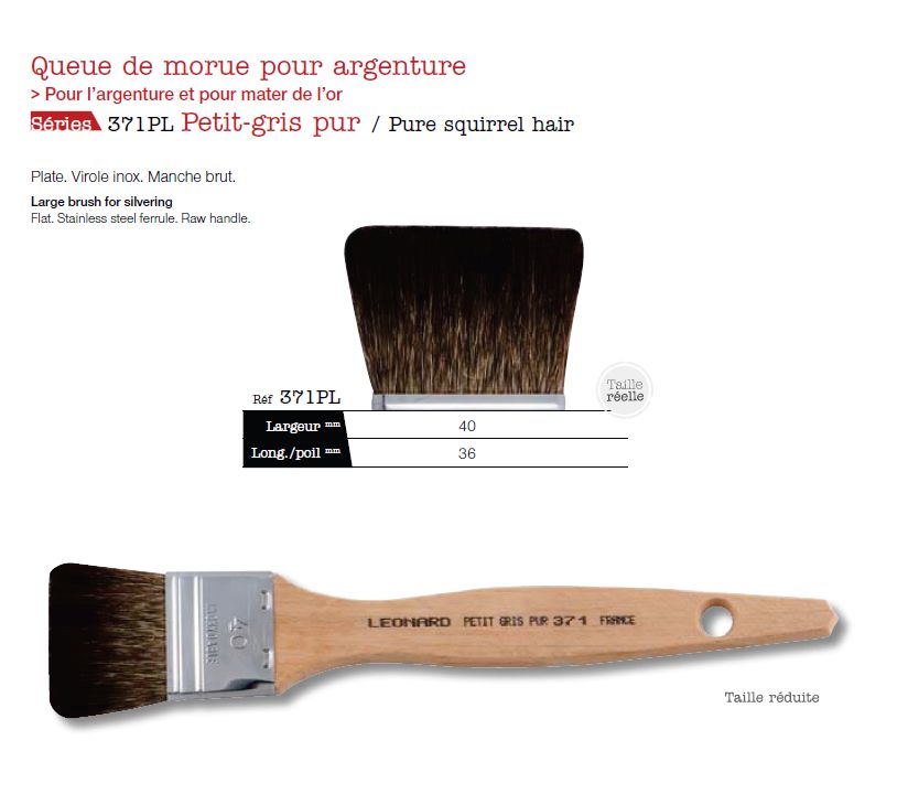 Pincel ancho en petigrís puro para la plateadura. Plano. Virola en acero inoxidable. Mango bruto. Anchura : 40 mm.