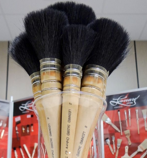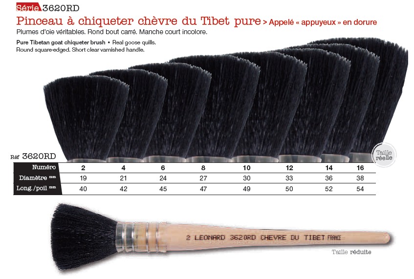Pincel para jaspear en cabra fina da Tibet. Fijado con plumas. Redondo con extremidad cuadrada. Mango corto incoloro.