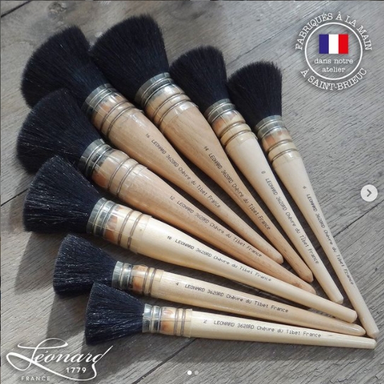 Fine Tibetan goat hair chiqueter brush. Fixed with quills. Round square-edged. Short natural polished handle.
