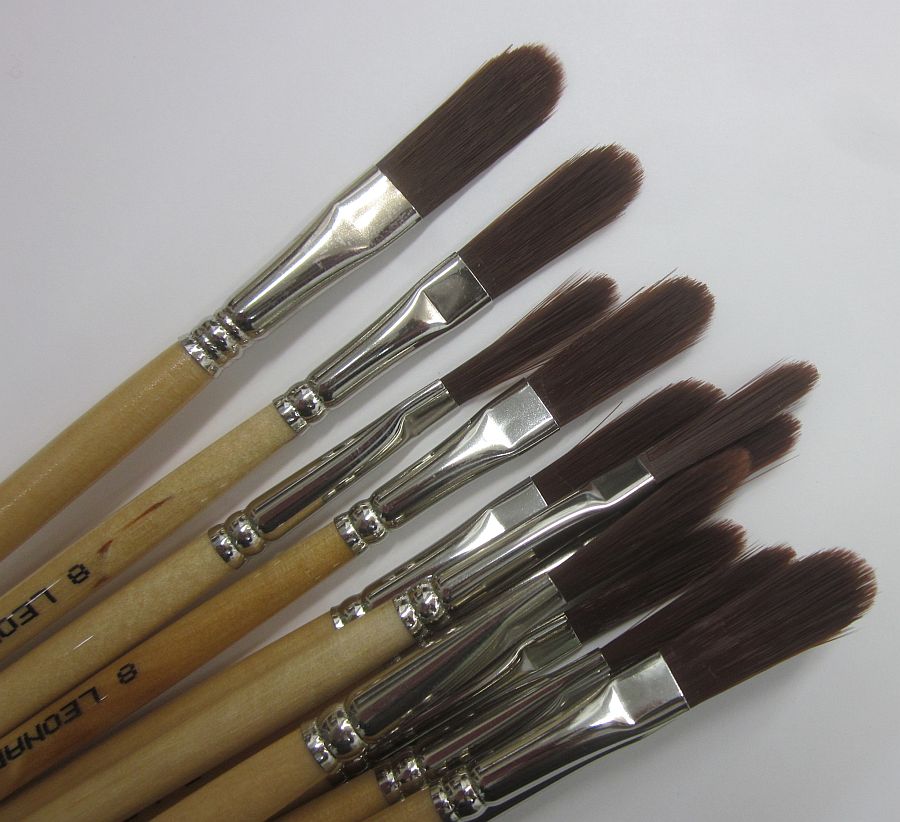 Pinsel aus aus hell rote Kunstfäser. Flache Zungenform. Lange Haarlänge. Verbunden mit Draht. Langer roher Stiel.