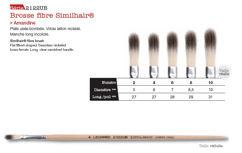 Pincel para jaspear en fibra sintética roja violacea. Plano con extremidad abombada. Longitud de pelo : larga. Ligado con alambre. Mango largo bruto.