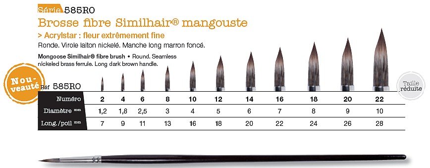 Dark burgundy synthetic fibre Similhair Acrylstar brush similar to Mongoose hair. Round. Seamless nickeled brass ferrule. Blue handle with grey tip.