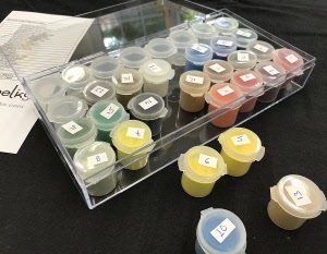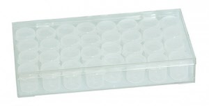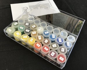 Pigment box with 32 mini-jars with lid. Box with crystal clear hinged lid; made of plastic. External dimensions: L x W x H: 217 x 115 x 35 mm. Contains 32 - empty - mini-jars of 7.5 ml. The ideal storage for small amounts of pigments.