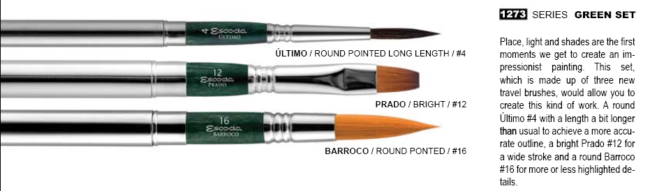 Set of round brushes combining a Perla #10 for its perfect point (although a medium-sized number is used), a large-sized Ultimo, #16, with an excellent water load, and a Prado #6 for the smallest details.Essential for the most creative moments.