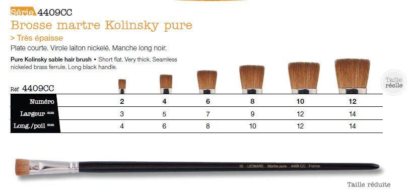 Pinsel aus reinen Rotmarderhaaren. Flach kurz. Sehr dick. Nahtlose Silberzwinge. Langer schwarzlackierter Stiel.