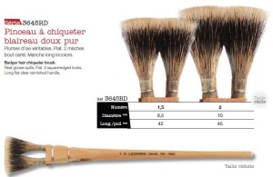 Pinceau à chiqueter blaireau doux pur. Entre-plumes. Plat. 2 mèches bout carré. Manche plat long incolore.