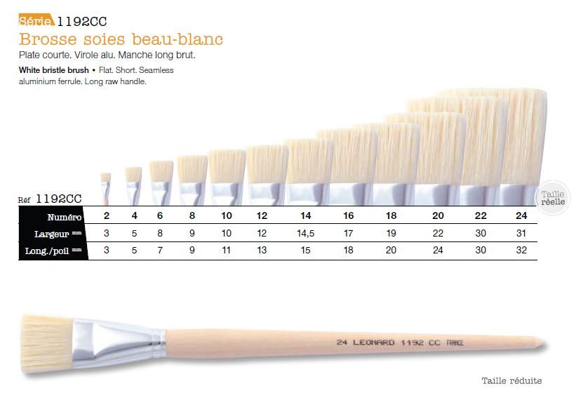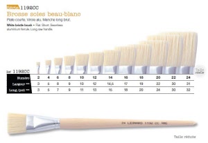 Brosse soies beau-blanc. Plate courte-carrée. Virole aluminium. Manche long brut.