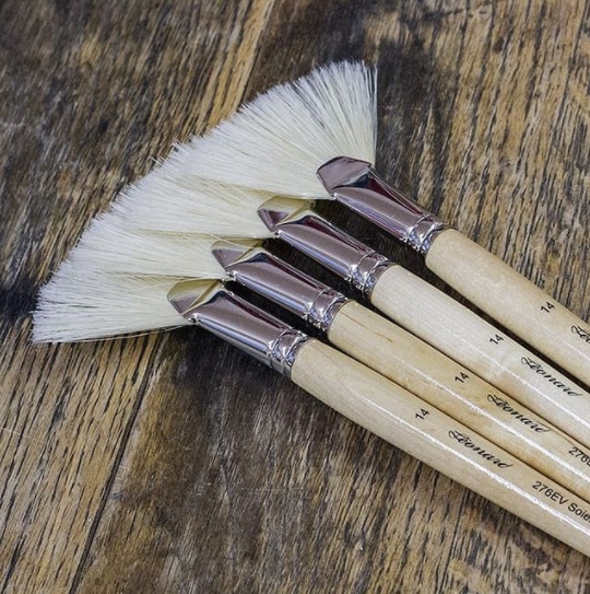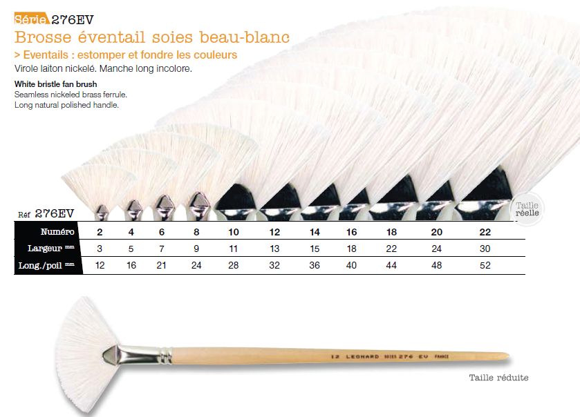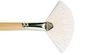 Brosse éventail soies beau-blanc. Virole laiton nickelé. Manche long incolore.