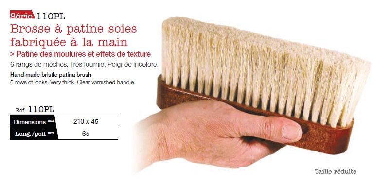 Brosse à patine soies 6 rangs. Montée main. Très fournie. 210 x 45 mm. Sortie 65 mm. Poignée incolore.