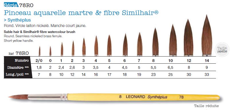 Pinceau aquarelle "Synthé Plus" mélange martre + fibre synthétique. Rond. Virole laiton nickelé. Manche court jaune.