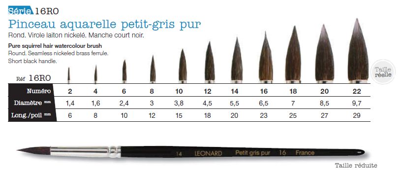 Pinceau aquarelle petit-gris pur. Rond. Virole laiton nickelé. Manche court noir.