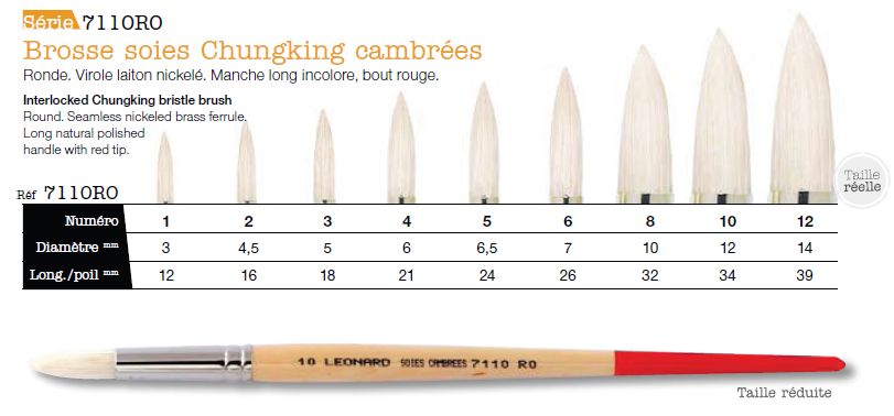 Brosse soies cambrées. Ronde. Virole laiton nickelé. Manche long incolore, bout rouge.