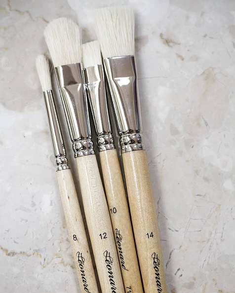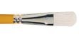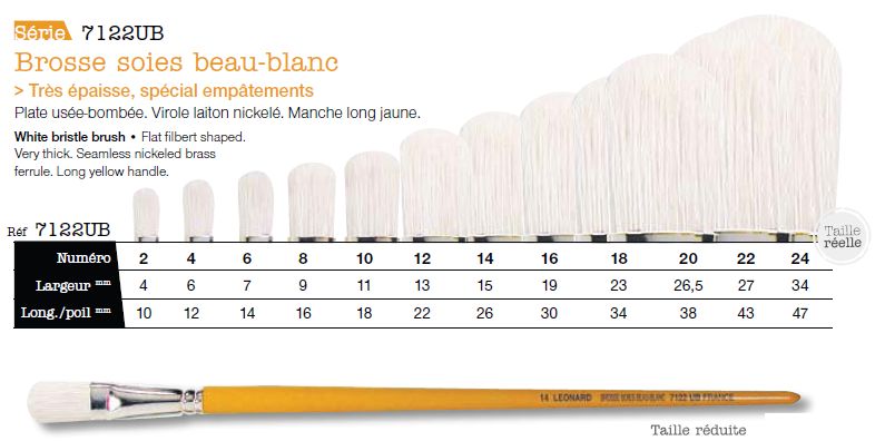 Brosse soies beau-blanc. Plate usée-bombée. Très épaisse. Virole laiton nickelé. Manche long jaune.