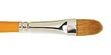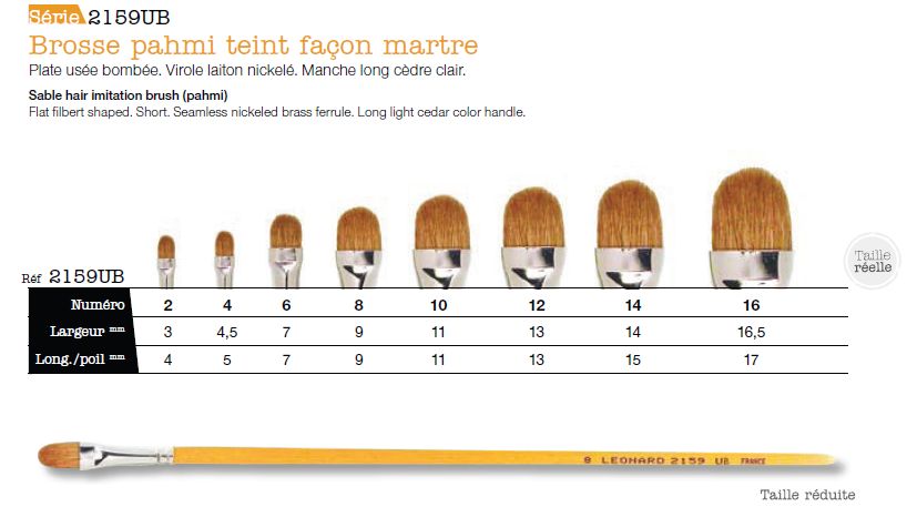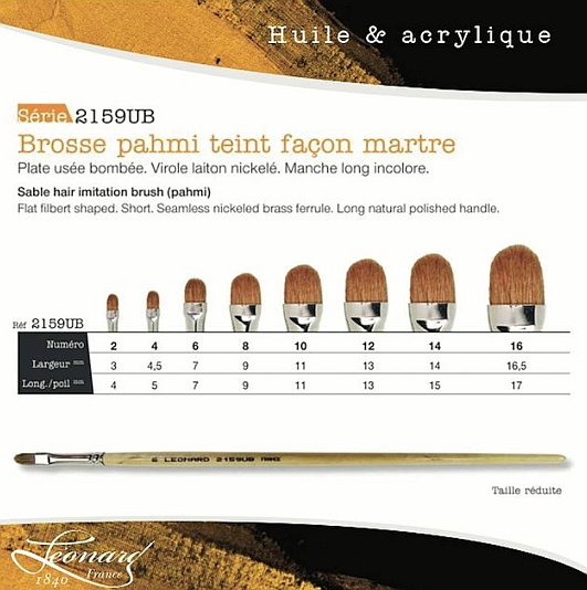 Brosse pahmi teint façon martre. Plate usée-bombée. Virole laiton nickelé. Manche long cèdre clair.