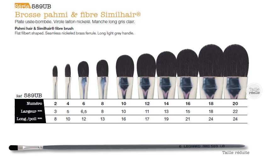 Brosse "Anthracite" mélange pahmi + fibre synthétique. Plate usée-bombée. Virole laiton nickelé. Manche long gris foncé, bout gris clair.