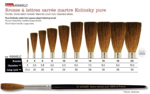 Brosse à lettres carrée martre Kolinsky pure. Ronde. Sortie standard. Virole laiton nickelé. Manche court noir. Grandes tailles.