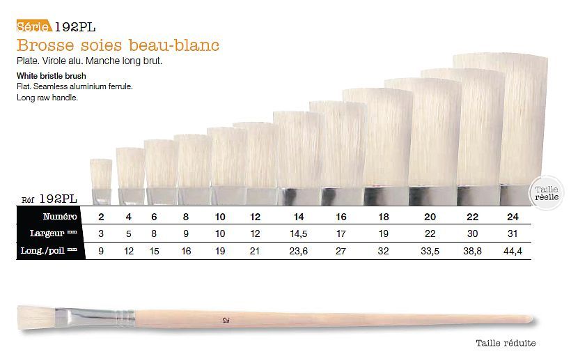 Brosse soies beau-blanc. Plate. Virole aluminium. Manche long brut.