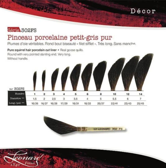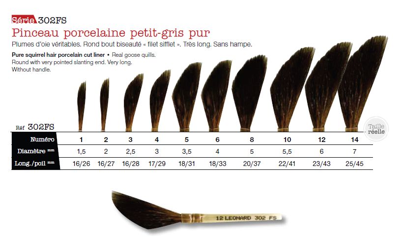 Pinceau porcelaine petit-gris pur. Sur plume. Rond bout biseauté "filet sifflet". Sortie très longue. Sans hampe.