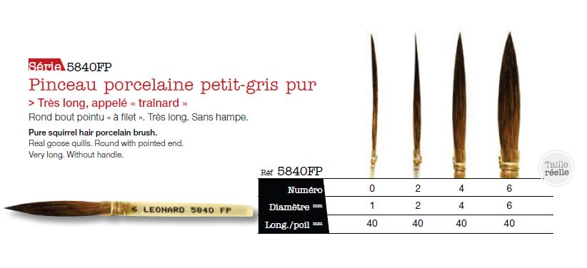 Pinceau porcelaine petit-gris pur. Sur plume. Rond bout pointu "à filet". Sans hampe. Sortie 40 mm pour tous les n°.