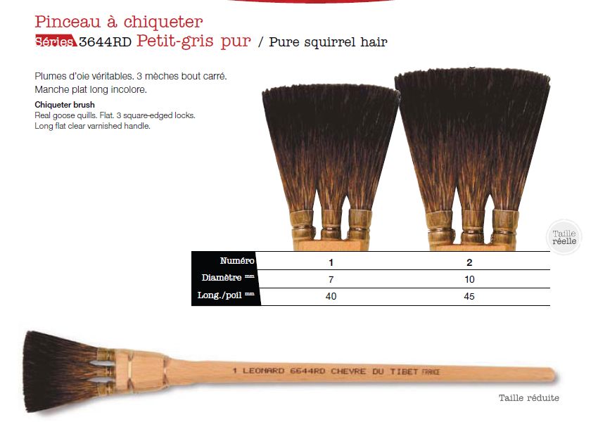 Pinceau à chiqueter petit-gris pur. Entre-plumes. Plat. 3 mèches bout carré. Manche plat long incolore.