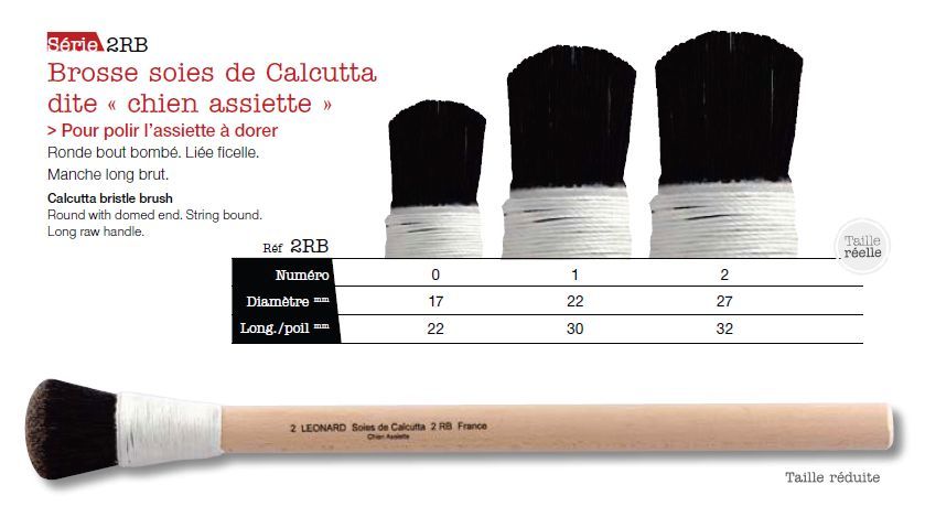 Brosse soies de Calcutta dite "chien assiette" pour la dorure. Ronde bout bombé. Liée ficelle. Manche long brut.