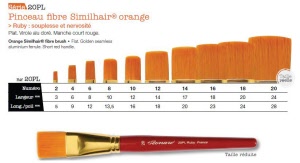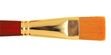 Pinceau fibre synthétique dorée. Plat. Virole aluminium doré. Manche court rouge cerise.