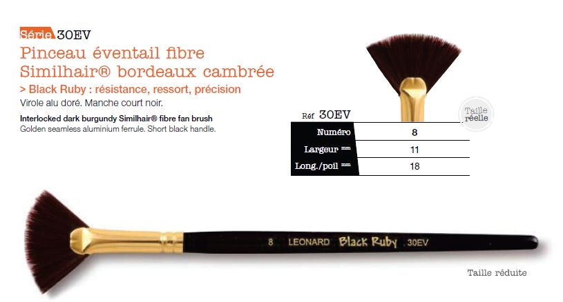Pinceau éventail fibre synthétique bordeaux foncé. Virole aluminium doré. Manche court noir. N° 8. Largeur 11 mm.