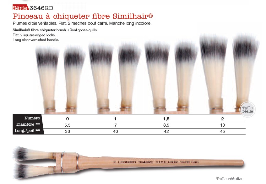 Pinceau à chiqueter Fibre Synthétique fleurée grise . Entre-plumes. Plat. 2 mèches bout carré. Manche plat long incolore.
