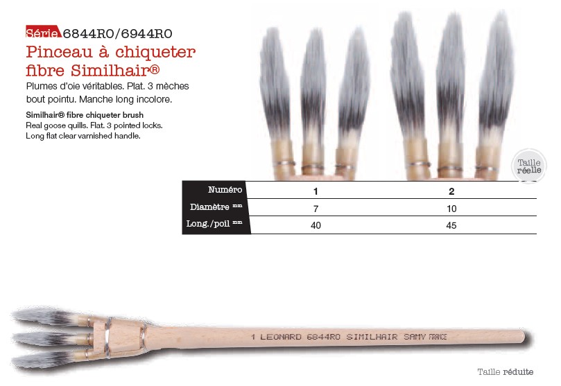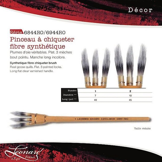 Pinceau à chiqueter Fibre Synthétique fleurée grise . Entre-plumes. Plat. 3 mèches bout pointu. Manche plat long incolore.