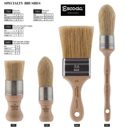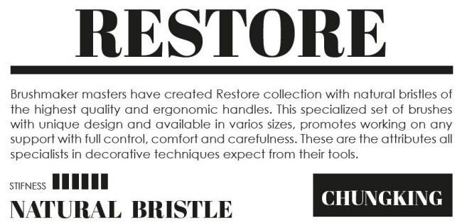 Les maîtres-fabriceurs de pinceaux et brosses d'Escoda ont développé la série RESTORE avec des poils naturels Chungking de la plus haute qualité et des poignées ergonomiques. Cet ensemble spécialisé de brosses au design unique est disponible en différentes tailles et offre un soutien, un contrôle complet, du confort et de l'attention au travail, telles sont les qualités que les spécialistes des techniques décoratives attendent de leurs outils!