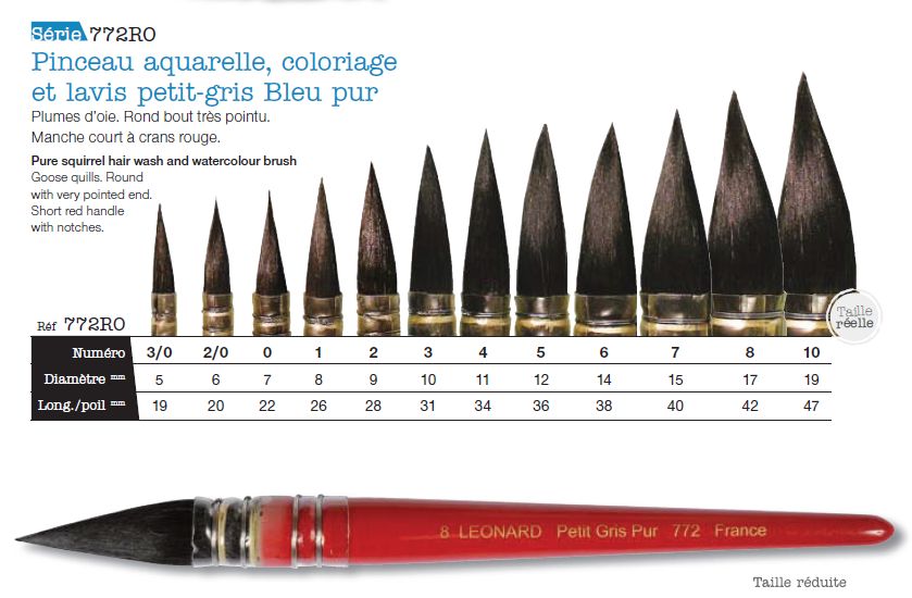 Pinceau aquarelle, coloriage et lavis en petit-gris pur. Entre-plumes. Rond bout très pointu. Manche court à crans nacré rouge.