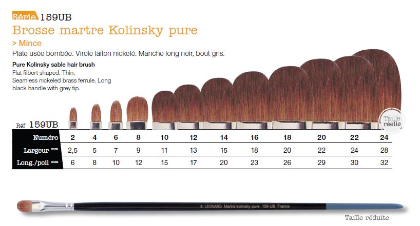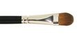 Kolinsky marter penseel. Plat, afgerond en zeer dun. Vernikkelde huls. Lange zwart gelakte steel met grijze tip.