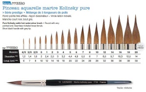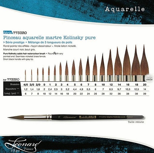 Meest prestigieuze reeks aquarelpenselen in Kolinsky Marter. Speciaal voor grafische toepassingen ; rond met uiterst fijne punt. Vernikkelde huls. Korte zwart gelakte steel met grijs uiteinde.Er worden 3 verschillende haarlengtes gebruikt in dit penseel.