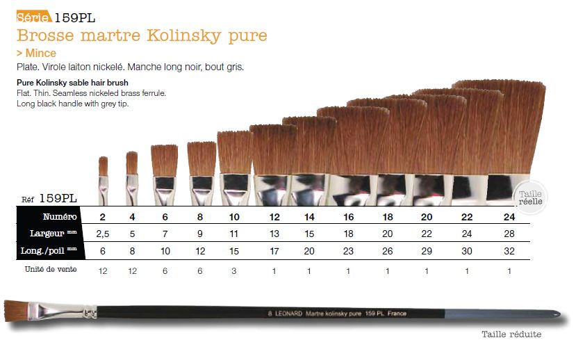 Kolinsky Marter penseel. Plat, dun. Vernikkelde huls. Lange zwart gelakte steel met grijs gelakt uiteinde.