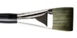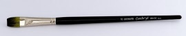 Penseel in synthetisch redelijk stijf bronskleurig haar. Interlocked opstelling ( = natuurlijke kromming naar midden van het penseel gericht voor betere vormeigenschappen ). Vernikkelde huls. Lange zwart gelakte steel.