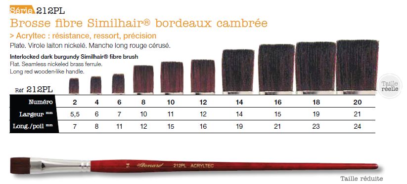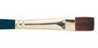 Penseel synthetisch haar bordeauxkleurig. Plat en recht. Vernikkelde huls. Lange blauw gelakte steel met grijs uiteinde.